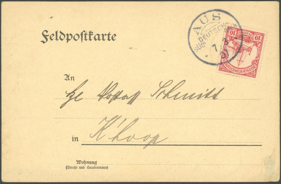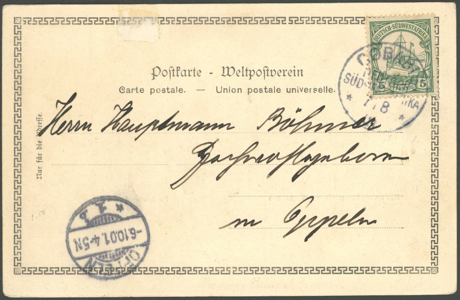 GERMAN SOUTHWEST AFRICA POSTMARK. From, 7.3.07, on 10 Pf. With watermark, fieldpost card to Keetmanshoop, very fine