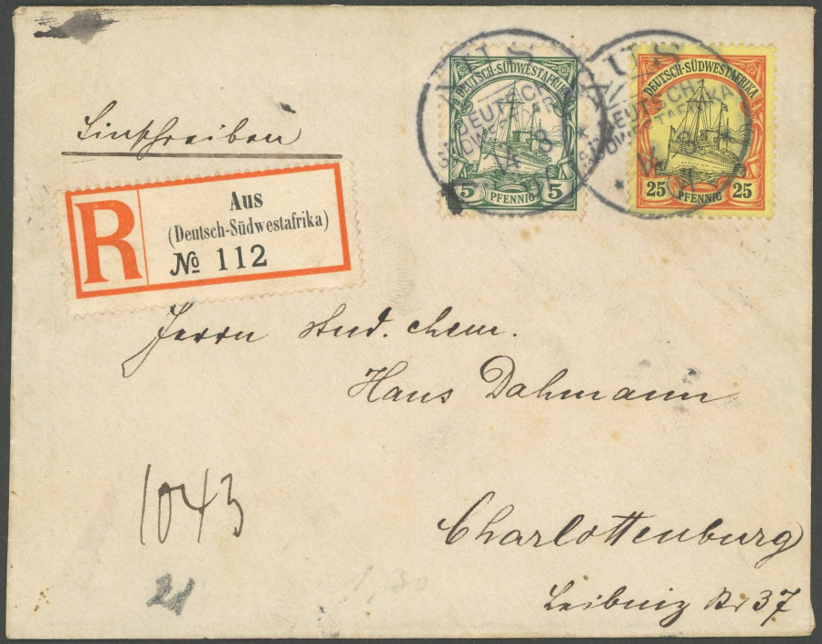 GERMAN SOUTHWEST AFRICA POSTMARK. From, 14.8.07, on small registered cover to Charlottenburg with 5 and 25 Pf., superb