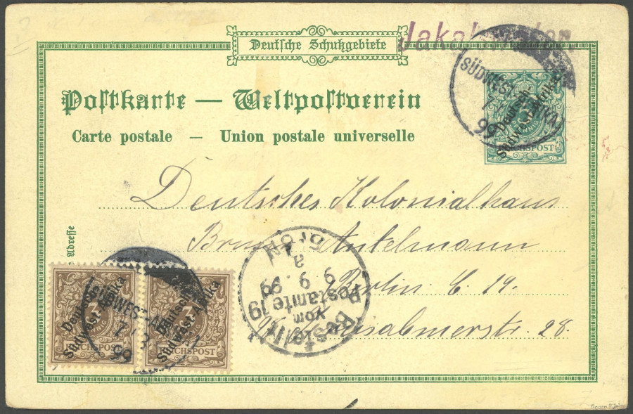 GERMAN SOUTHWEST AFRICA POSTMARK. JAKALSWATER, 7.9.99 on cancellation used in different places I, 5 Pf. Private postcard (Major Leutwein) with 2 time 3 Pf. Additional franking to Berlin, superb, expertized Buehler (Image)