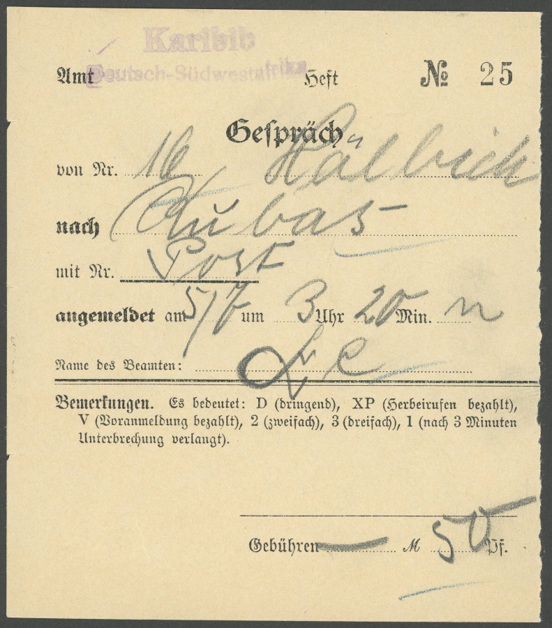 GERMAN SOUTHWEST AFRICA POSTMARK. KARIBIB, violet Innendienstzweizeiler on Telephonquittung for a Gesprch to Kubas, superb, R!