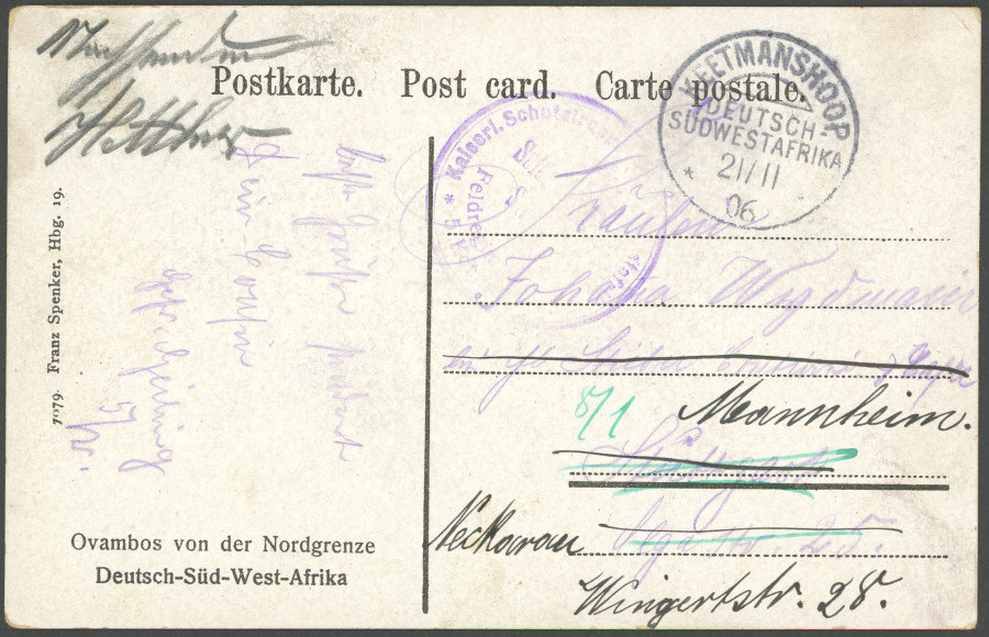 GERMAN SOUTHWEST AFRICA POSTMARK. KEETMANSHOOP, 21.11.06, on coloured army postal service picture postcard with violet Soldier letter stamp to Stuttgart, superb (Image)