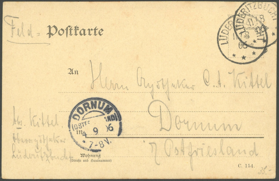 GERMAN SOUTHWEST AFRICA POSTMARK. LDERITZBUCHT, 11.8.06 (next to the last day), 2 time on fieldpost card to Dornum, very fine