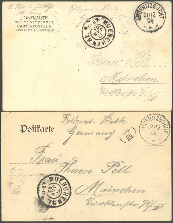 GERMAN SOUTHWEST AFRICA POSTMARK. LDERITZBUCHT, 12.04, 2 various army postal service picture postcards, 1 time year date 04 handwritten repainted, superb (Image)