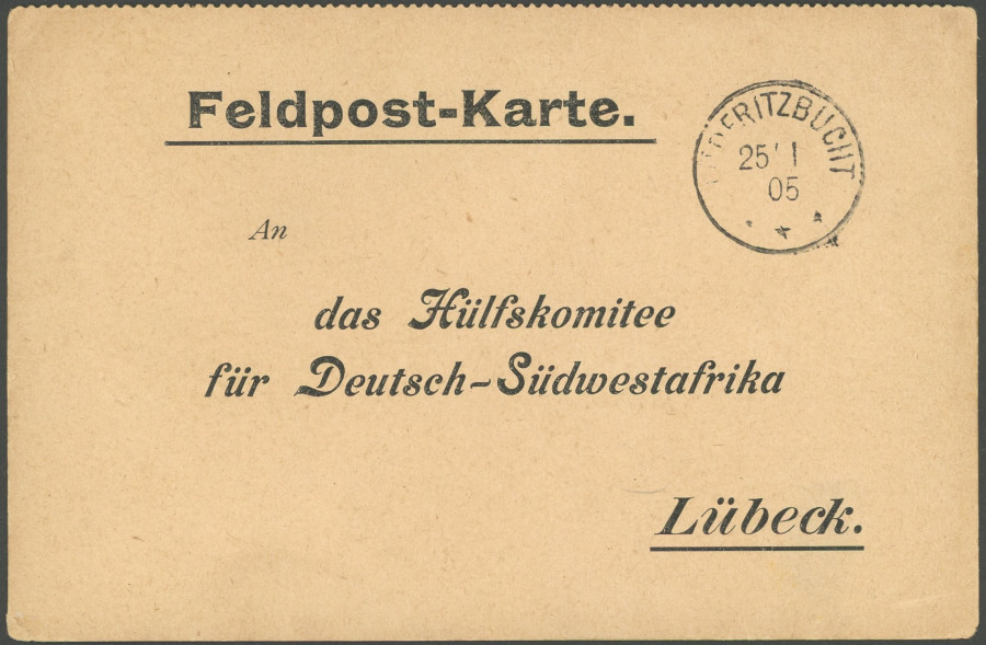 GERMAN SOUTHWEST AFRICA POSTMARK. LDERITZBUCHT, 25.1.05, fieldpost printed form card to the Hülfskomitee for German Southwest Africa Luebeck, superb (Image)