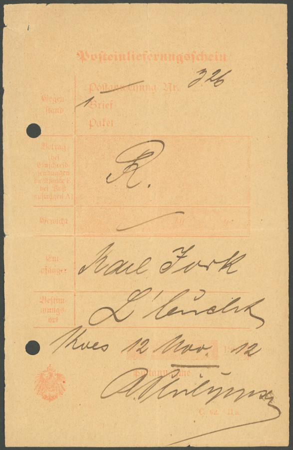 GERMAN SOUTHWEST AFRICA POSTMARK. KOES, 12.11.12, handwritten on postal service delivery certificate (C62 11a), punched, very fine