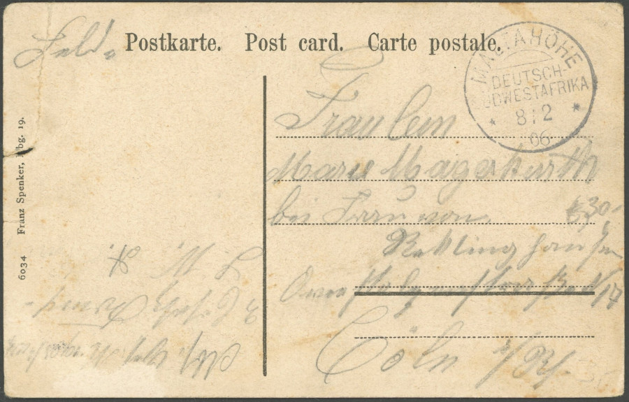 GERMAN SOUTHWEST AFRICA POSTMARK. MALTAHHE, 8.2.06, on coloured army postal service picture postcard to Cölln, Bedarfsmngel