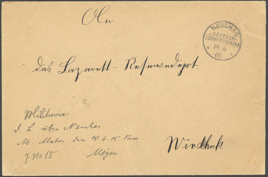 GERMAN SOUTHWEST AFRICA POSTMARK. NAUCHAS, 19.6.05, on military - letter to Windhoek, very fine (Image)
