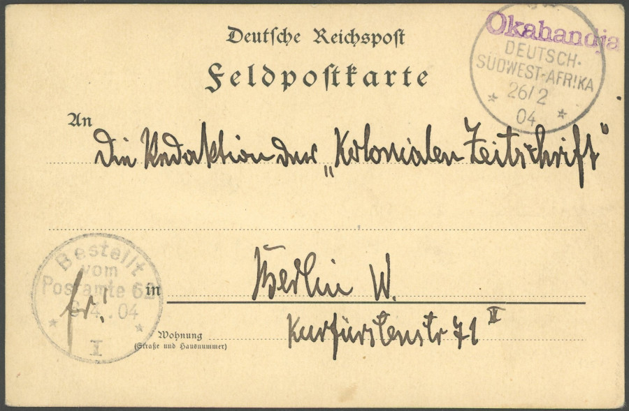 GERMAN SOUTHWEST AFRICA POSTMARK. OKAHANDJA, 26.2.04, fieldpost card to Berlin, superb (Image)