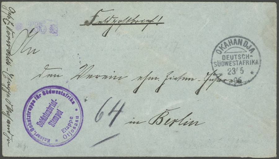 GERMAN SOUTHWEST AFRICA POSTMARK. OKAHANDJA, 23.5.06, fieldpost letter to Berlin, rare letter cancel stage OTJOSAZU, superb, R!