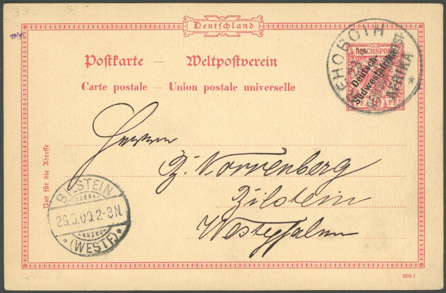 GERMAN SOUTHWEST AFRICA POSTMARK. REHOBOTH, 23.4.00, on 10 Pf. Postal stationery postcard to Bilstain, reverse unlabeled, superb