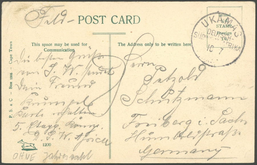 GERMAN SOUTHWEST AFRICA POSTMARK. UKAMAS, 10.7. (without year date) on army postal service picture postcard to Saxony, superb