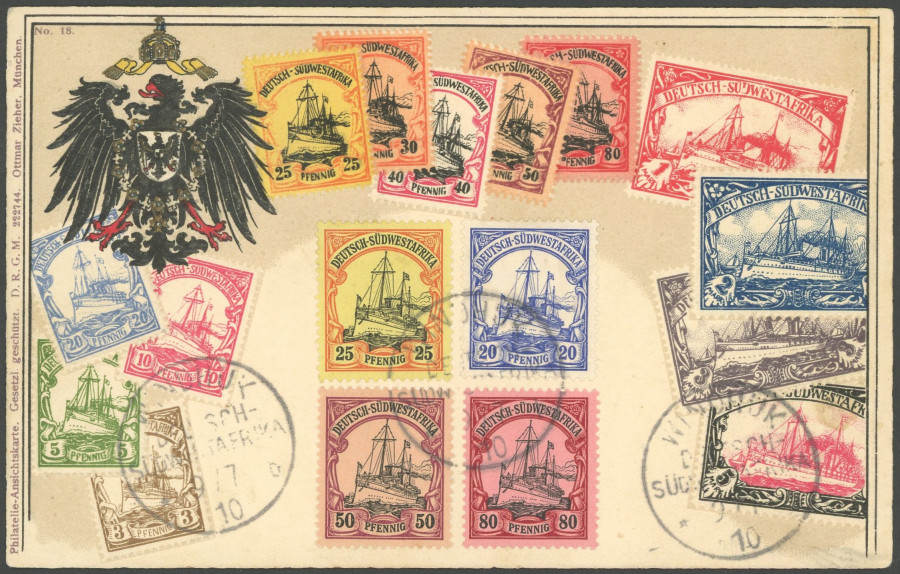 GERMAN SOUTHWEST AFRICA POSTMARK. Windhoek *b, 9.7.10, on Prgekarte with 4 values Schiffshausgabe, reverse unlabeled, superb