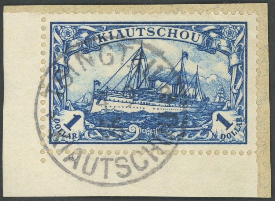 KIAUTSCHOU. 1905, 1 $ schwrzlichblau, without watermark, gezhnt B, from the left lower corner of the sheet, superb piece of letter, signed, Michel (160.-) (Image)