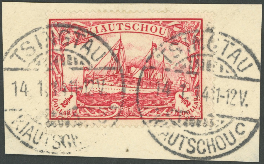 KIAUTSCHOU. 1907, 1/2 $ dark carmine red, watermarked, peace printing, superb piece of letter, Michel (80.-) (Image)