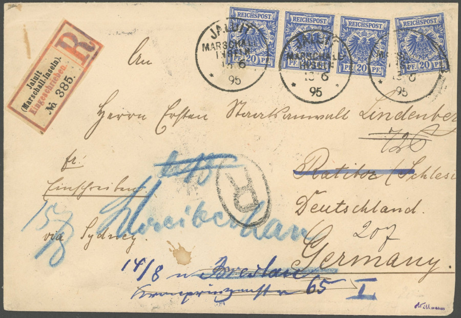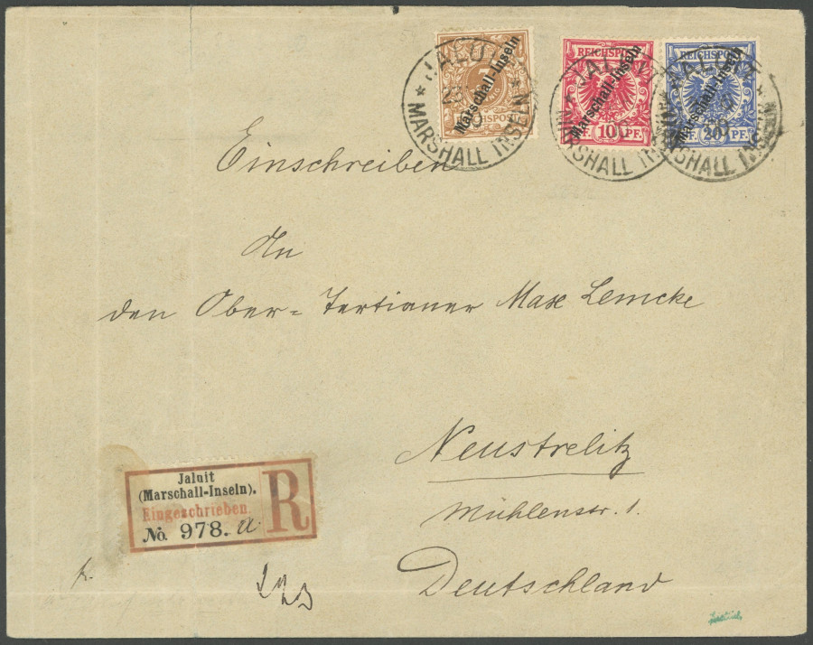 MARSHALL ISLANDS. 23.6.00, 3 Pf. Ochre-brown with 10 and 20 Pf. Jaluit-issue with second cancel Marshall Islands on registered cover to Neustrelitz, registered label (Einfeldt type 2a), the letter has slight transport