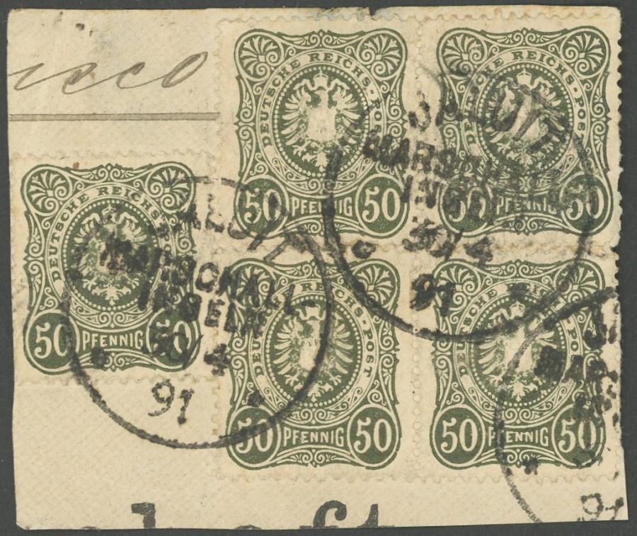 MARSHALL ISLANDS FORERUNNER. 30.4.91, 50 Pf. Dark olive, 5 time on piece, as well 2 horizontal pairs, cancel JALUIT 1, Zhnung of the right stamps partly a little pushed, decorative superb piece of letter, each value