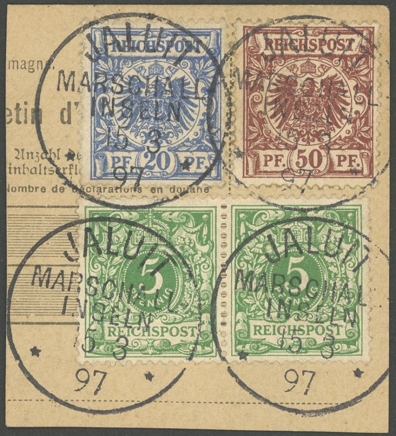 MARSHALL ISLANDS FORERUNNER. 15.3.97, parcel card section with horizontal pair 5 Pf. Green and 20 Pf. And 50 Pf., cancel JALUIT 1, decorative superb piece of letter, RR! (Image)