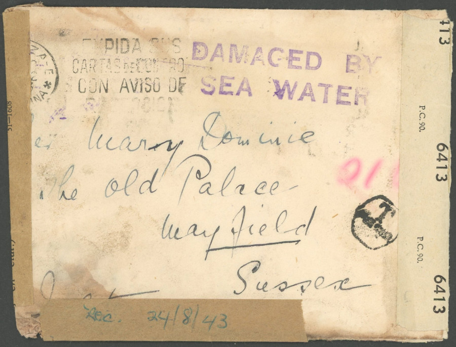 GREAT BRITAIN COLLECTIONS, LOTS. 1943, Catastrophes letter to Sussex, with violet two-line cancel DAMAGED BY SEA WATER and various seal label, very fine (Image)