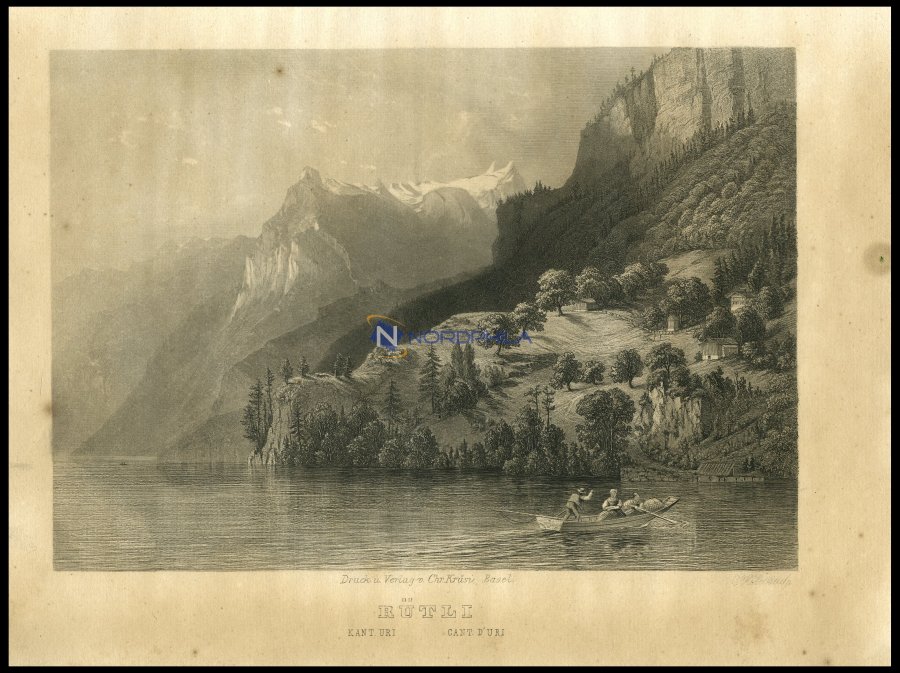 OLD CITY VIEWS SWITZERLAND. Ruetli / canton URI, general view, steel engraving by Huber about 1840 (Image)