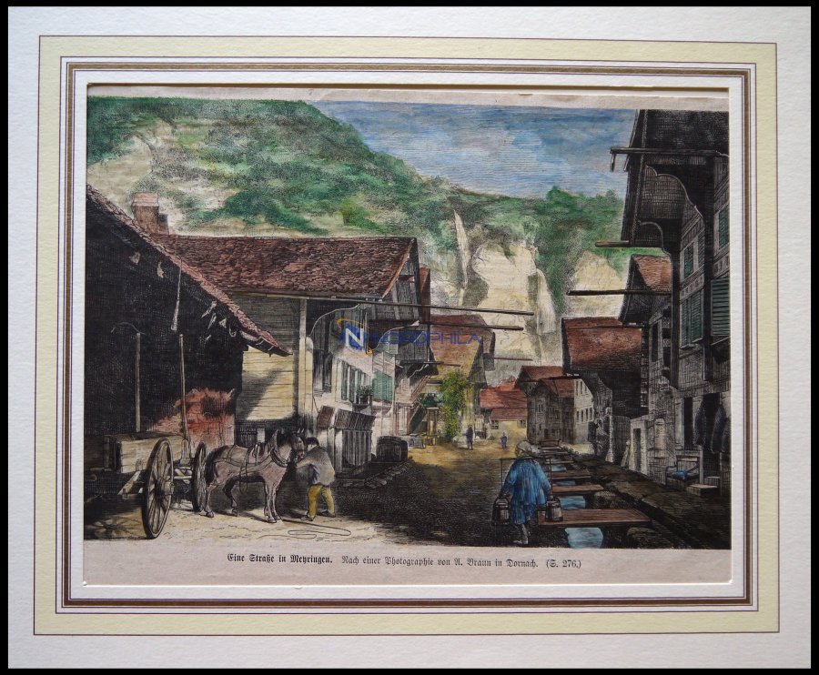 OLD CITY VIEWS SWITZERLAND. MEYRINGEN, partial view, coloured wood engraving from 1874 (Image)