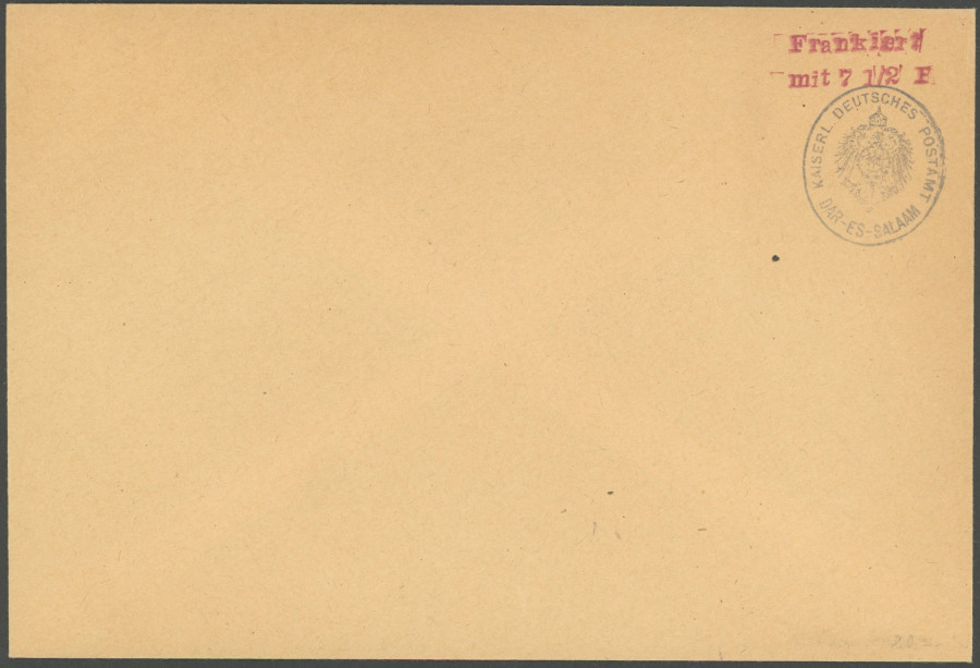 GERMAN EAST AFRICA POSTAL STATIONERIES. prepayment of postage: Daressalaam 7 ½ H. red, unused cover, superb (Image)
