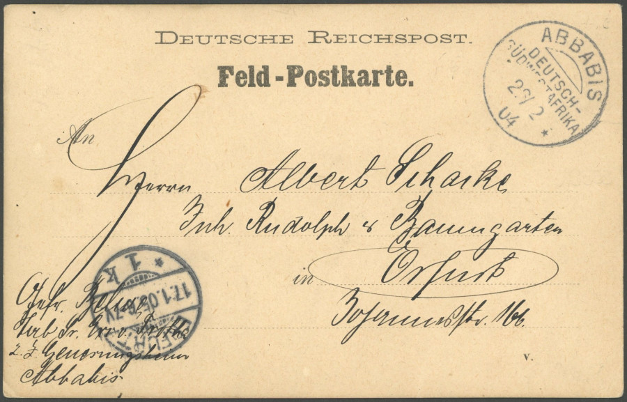 GERMAN SOUTHWEST AFRICA POSTMARK. ABBABIS, 23.2.04, on fieldpost card to Erfurth, superb (Image)