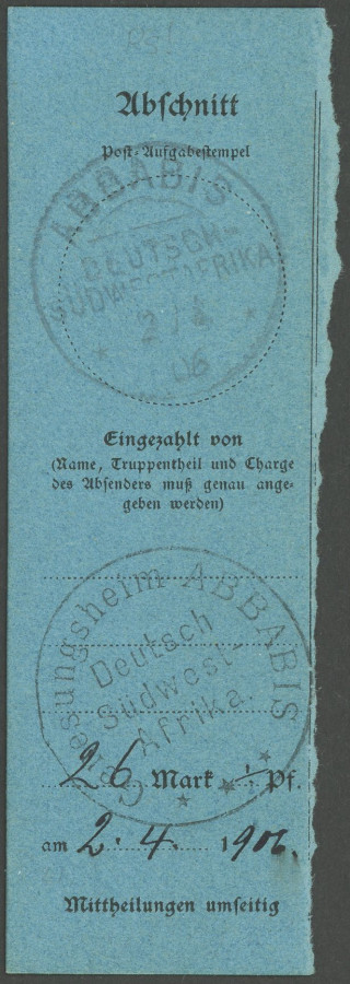 GERMAN SOUTHWEST AFRICA POSTMARK. ABBABIS, 2.4.06, on giro transfer form segment with senders mark convalescent home ABBABIS, superb