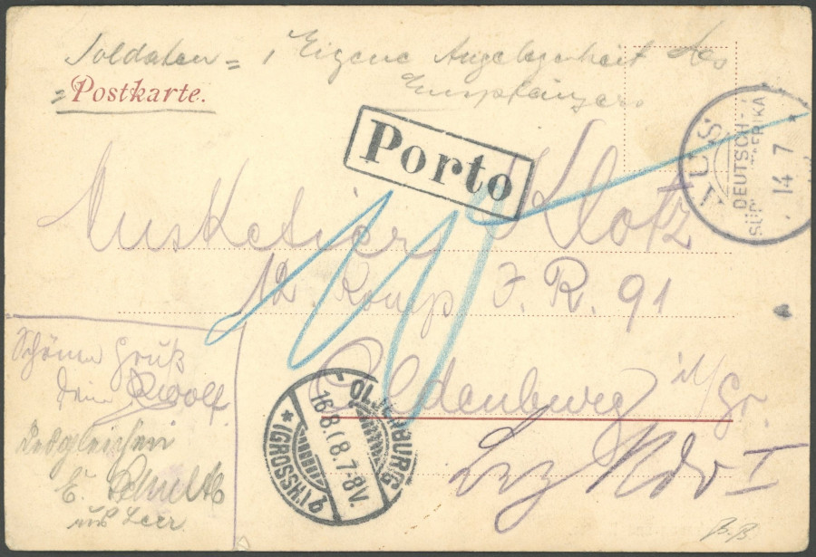 GERMAN SOUTHWEST AFRICA POSTMARK. from, 14.7.08, on soldiers postcard, with postage due allocated to Oldenburg, rare rectangle cancel with one line postage, superb, R! (Image)