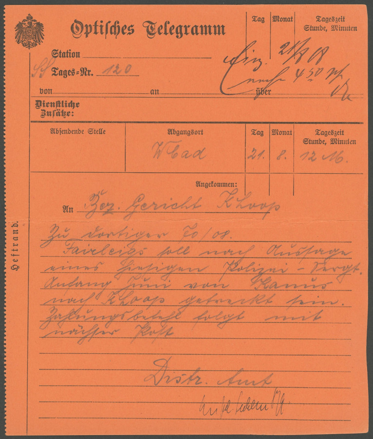 GERMAN SOUTHWEST AFRICA. 21.8.1908, optical telegram in dark orange from warm bath to the Court in Keetmanshoop, superb, R!