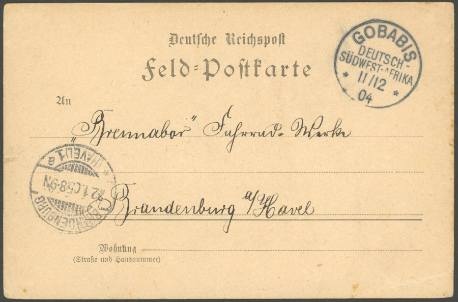 GERMAN SOUTHWEST AFRICA POSTMARK. GOBABIS, 11.12.04, on fieldpost card to Brandenburg / Havel, very fine (corner crease)