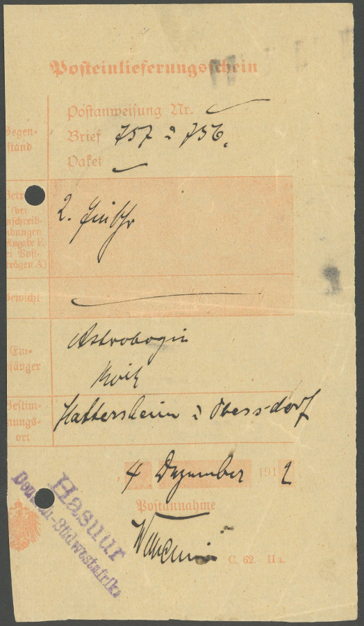 GERMAN SOUTHWEST AFRICA POSTMARK. HASUUR, violet double-line cancel, 4.12.12, on postal service delivery certificate, punched, very fine (Image)