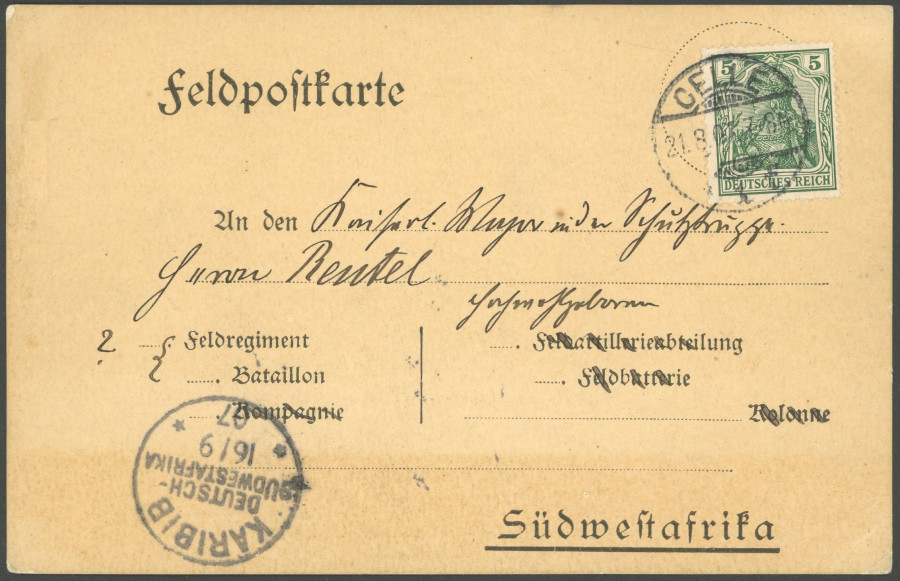 GERMAN SOUTHWEST AFRICA POSTMARK. KARIBIB, 16.9.07, as arrival postmark on franked fieldpost card from Celle, superb