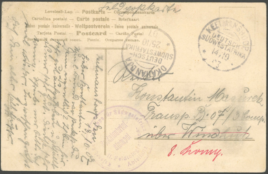 GERMAN SOUTHWEST AFRICA POSTMARK. KEETMANSHOOP, 14.10.03, on Inlandsfeldpostkarte from Keetmanshoop to OKAHANDJA over Windhoek, with Soldier letter stamp, superb (Image)
