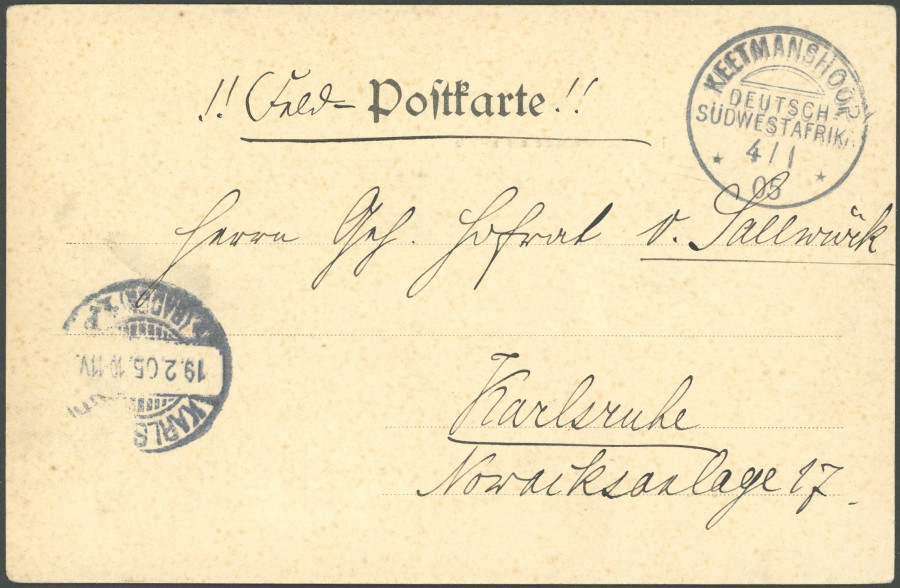 GERMAN SOUTHWEST AFRICA POSTMARK. KEETMANSHOOP, 4.1.05, on army postal service picture postcard to Karlsruhe, superb