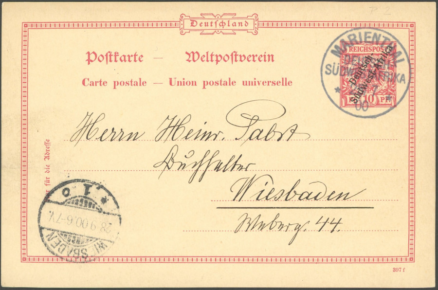 GERMAN SOUTHWEST AFRICA POSTMARK. MARIENTHAL, 25.7.00, on 10 Pf. postal stationery postcard to Wiesbaden, reverse unlabeled, superb