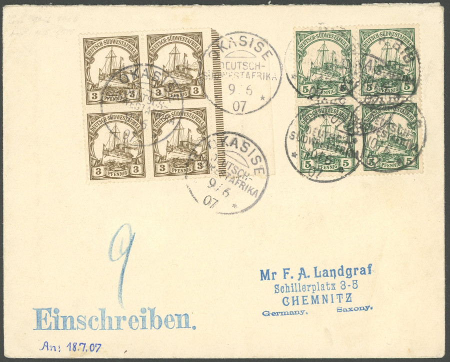 GERMAN SOUTHWEST AFRICA POSTMARK. OKASISE, 9.6.07, on registered cover to Chemnitz with block of four 3 and 5 Pf., watermarked, superb (Image)