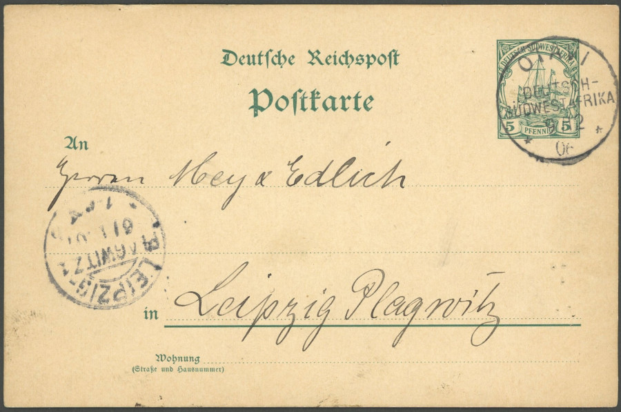 GERMAN SOUTHWEST AFRICA POSTMARK. OTAVI, 9.12.06, on 5 Pf. postal stationery postcard to LEIPZIG nuisance joke, written in URUPUPA, very fine, R! (Image)