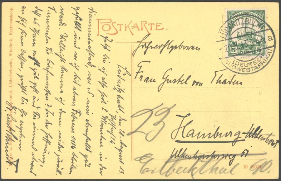 GERMAN SOUTHWEST AFRICA POSTMARK. LÜDERITZBUCHT, 20.8.13, on picture postcard (Diamantenwäsche) with 5 Pf. to Hamburg, superb