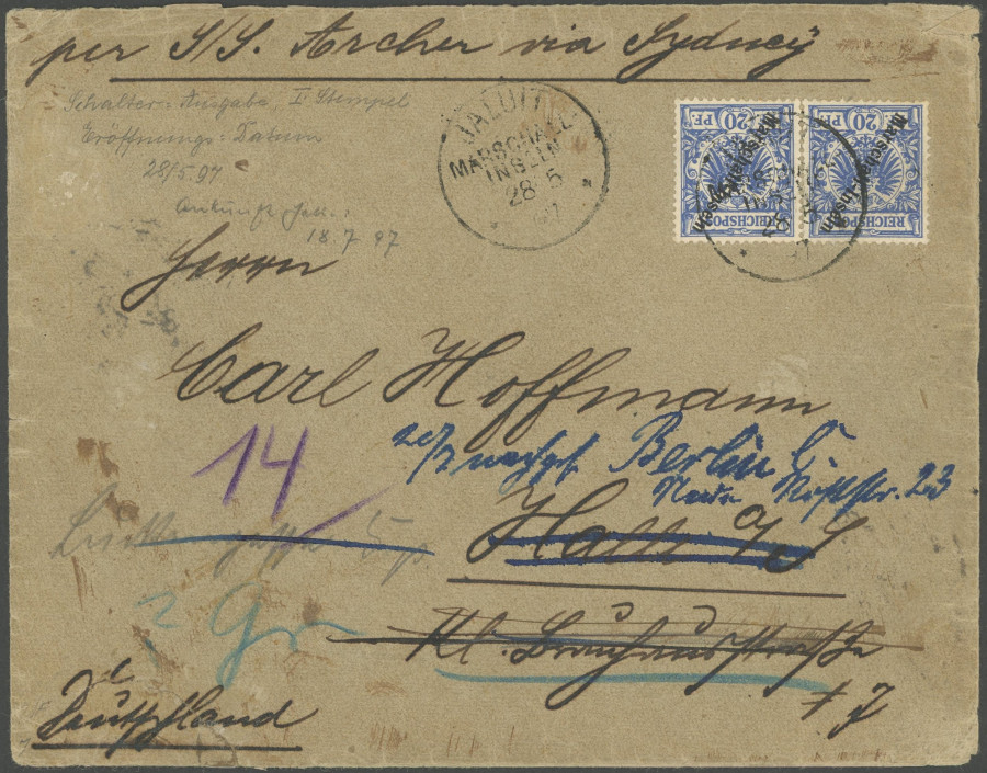 MARSHALL ISLANDS. 13.6.00, 20 Pf. Berlin issue in the vertical pair as multiple franking with second cancel on registered linen letter the Jaluit society to Hamburg, traces of usage, stamps in superb condition,