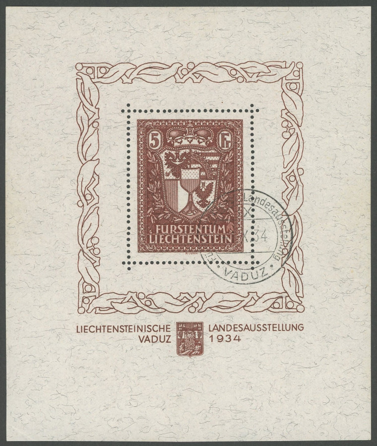 LIECHTENSTEIN. 1934, souvenir sheet national exhibition, special cancel, superb, Michel 3000.- (Image)
