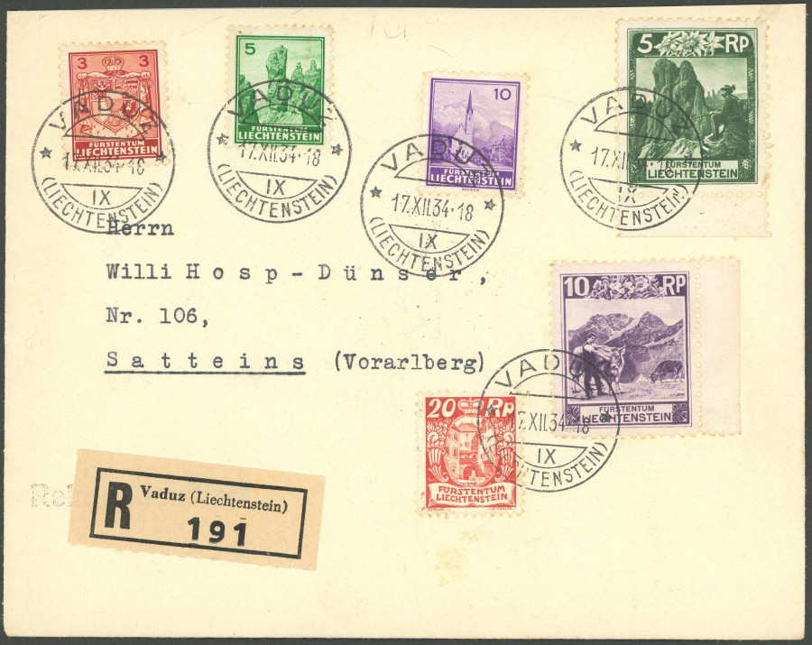 LIECHTENSTEIN. 17.12.1934, 3 - 10 Pf. postal stamps with additional franking on legitimate registered cover from first day, R! Michel 850.- (Image)