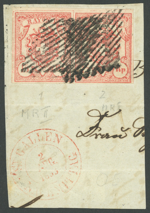 SWITZERLAND. 1852, 15 Rp small numeral in a horizontal pair, good to large margins all round on piece with red additional cancellation St. Gallen, superb (Image)