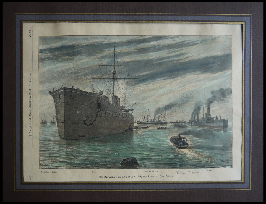 OLD CITY VIEWS GERMANY. KIEL: the tank training squadron with among others the Wuerttemberg, Saxony, Baden, coloured wood engraving, around 1880 (Image)