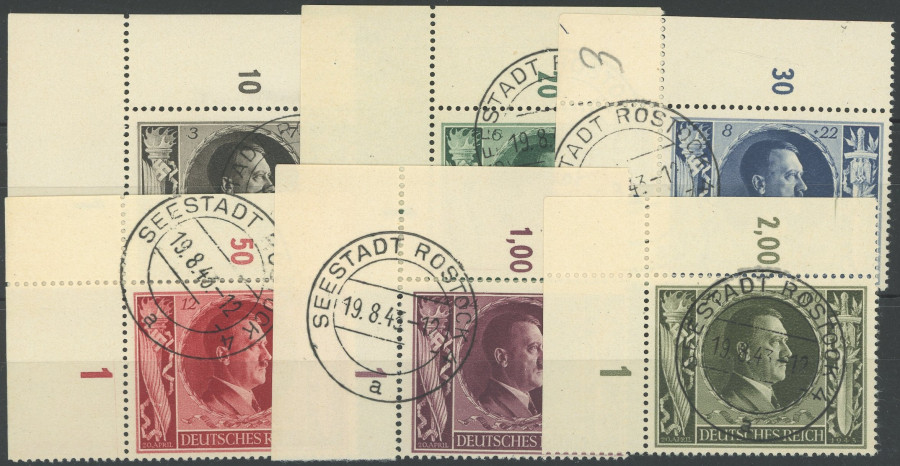 GERMAN REICH 1933 1945. 1943, 54. birthday, each from of the right upper corner of the sheet, cancel maritime city ROSTOCK, very fine set (Image)