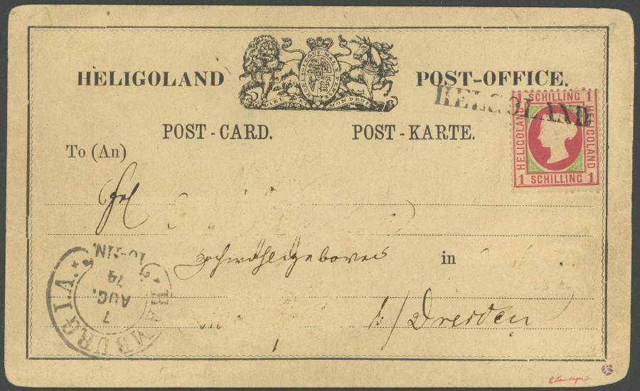 HELIGOLAND. 1874, 1 S. carmine / bright yellowish green on forerunner postcard with straight-line cancel type II to Dresden, Hufeisendurchgangsstempel Hamburg I. A., stamp one short perf otherwise superb, expertized