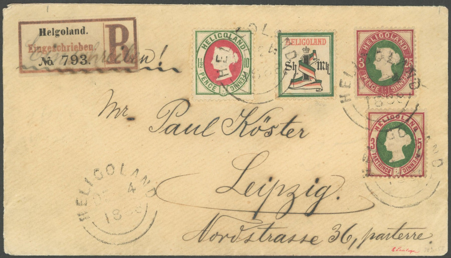 HELIGOLAND. 1890, 1 M. blue-green / gray black / medium rose with 3 different values additional franking on postage exceeding tariff rate registered cover to Leipzig, nice franking with different colours, superb,