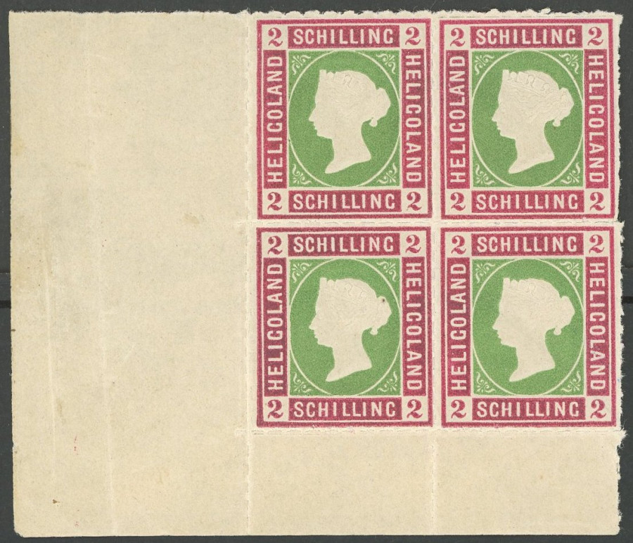 HELIGOLAND. 1867, 2 S. lilac carmine / yellowish green in the left lower corner margin block of four, mint never hinged, superb