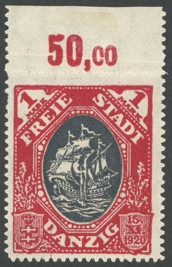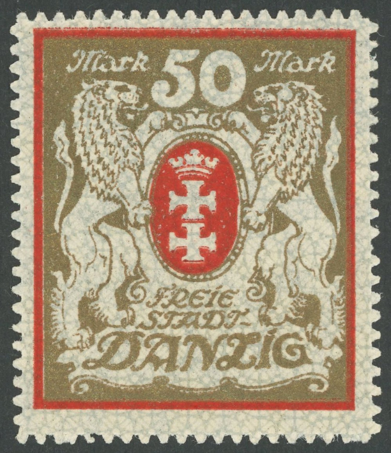 FREE CITY GDANSK. 1922, 50 M. red / gold, watermark 2 X, mint never hinged, small defects in the roulette otherwise superb, Michel 260.- (Image)