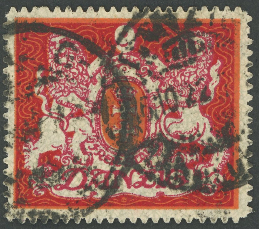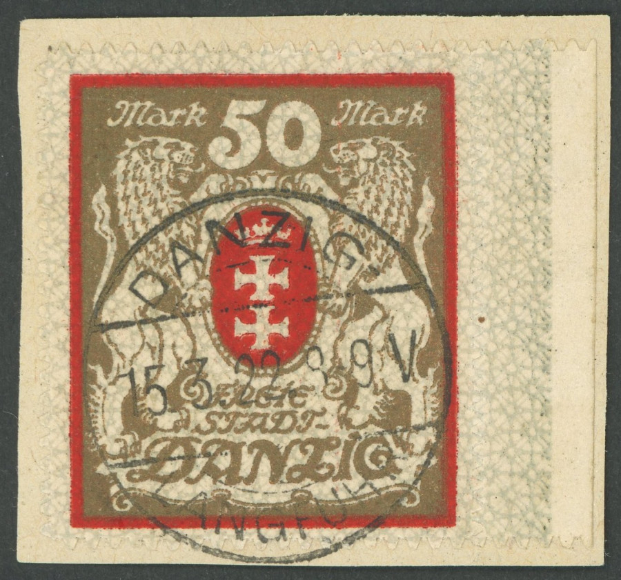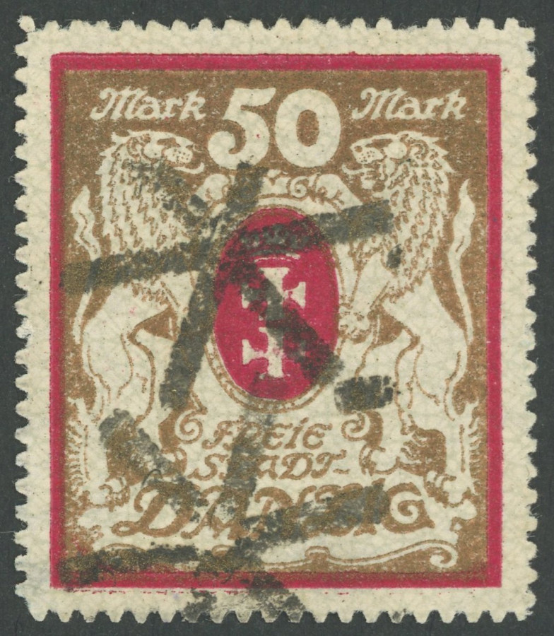FREE CITY GDANSK. 1922, 50 M. red / gold, watermark 2 X, used within the period of validity GROSSZÜNDER, normal roulette, superb, photo expertize Gruber, Michel 800.- R! (Image)