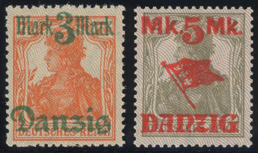FREE CITY GDANSK. 1920, 5 on 2 Pf. and 10 M. on 7 ½ Pf., purplish gray burelage, tips downward, mint never hinged, 2 superb items, Michel 130.- (Image)